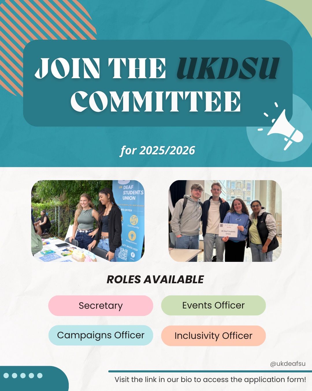 “Are you interested in joining the UKDSU Committee for 2025/2026? We’re excited to announce that we have four roles up for grabs! Swipe to view the available roles and read their full descriptions! This is a great opportunity to network with Deaf students and organisations across the UK, gain experience working with a Deaf student-led team, and make a real difference! The link to our application form can be found at the following link: https://lnkd.in/d9hmi_7f. Please free to contact us via [email protected]”