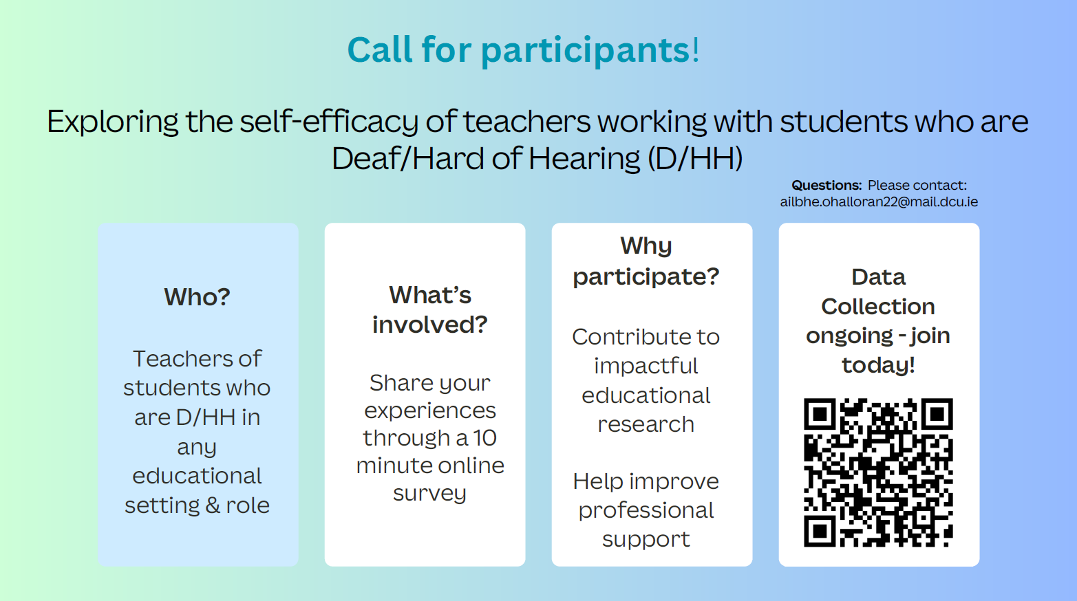 Recruitment request to teachers of students who are D/HH, working in mainstream schools, special schools/classes or in the Visiting Teacher service in Ireland.